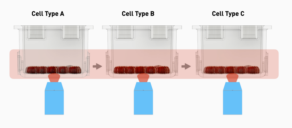 CELLBLOKS® platform has dimensions of a SBS standard Tissue Culture well plate. It has four sperate elongated channels with location for three separate Blocks. Each channel is filled with media (3-5 ml) to allow the cell-cell communication between the Blocks