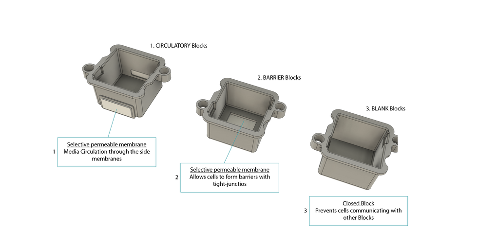 1. Circulatory Blocks™ provide a flat plastic surface for cells to grow with side circulatory windows on the walls allowing selective media diffusion (both inlet and outlet, simulating organs in systematic circulation e.g. liver, brain, heart, lung).