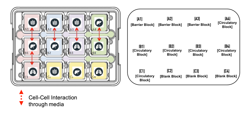 The example below shows how an intestine-hepatic model can be simulated in the CELLBLOKS® by using the Customised Kit platform to study the absorption, distribution and metabolism (ADME) of a drug or chemical as well as its effect on a target organ. Briefly, the Intestinal layer is modelled by growing CaCo-2 cells, for example, on Barrier Blocks that allows absorption of the drug. After absorption through the intestinal epithelium, the drug diffuses and is distributed into the channels (containing media) and to latter Blocks containing separate liver and lung compartments. The liver cells in the latter Circulatory Block metabolises the drug and the third compartment (lung) is used as a target organ. CELLBLOKS® can be used to set-up a tri-organ co-culture experiment and determine the effect of each compartment on the interaction between them. This is achieved in ONE PLATFOM by using combination of Barrier, Circulatory and Blank Blocks. As illustrated below, 12 Blocks are needed in total and they arranged in combinations of 3s, 2s and isolated blanks.